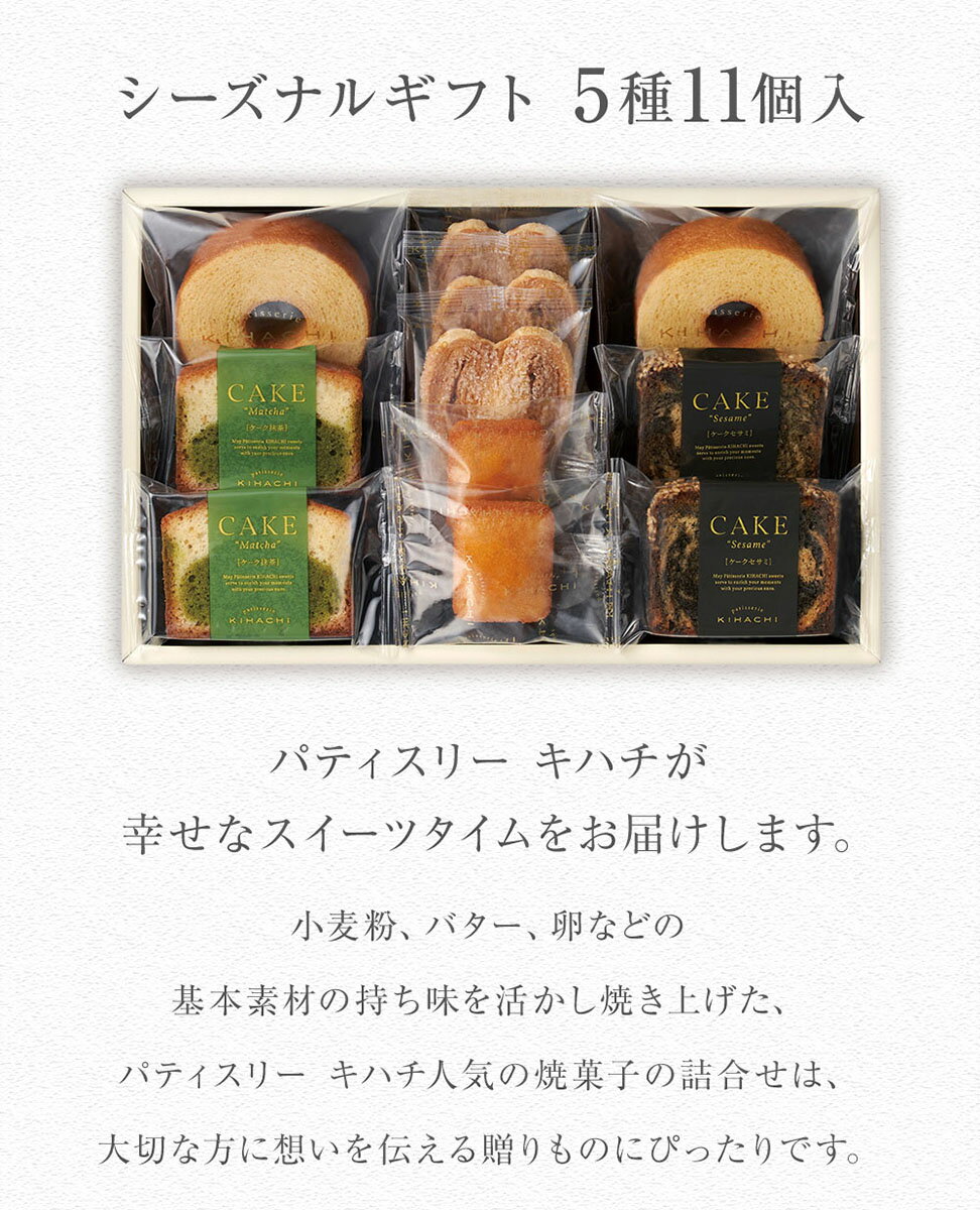 商品名 シーズナルギフト 5種11個入 内容量 バームクーヘン プレーン 2個 ケークセサミ 2個 ケーク抹茶 2個 パルミエ 3個 はちみつマドレーヌS 2個 計5種11個入 箱のサイズ 296×185×58mm 重量 508g 包装方法 お品物は包装紙でお包みしてお届けいたします。